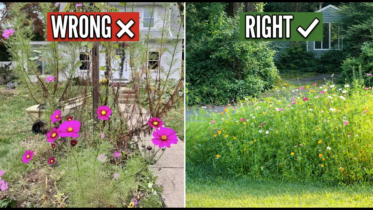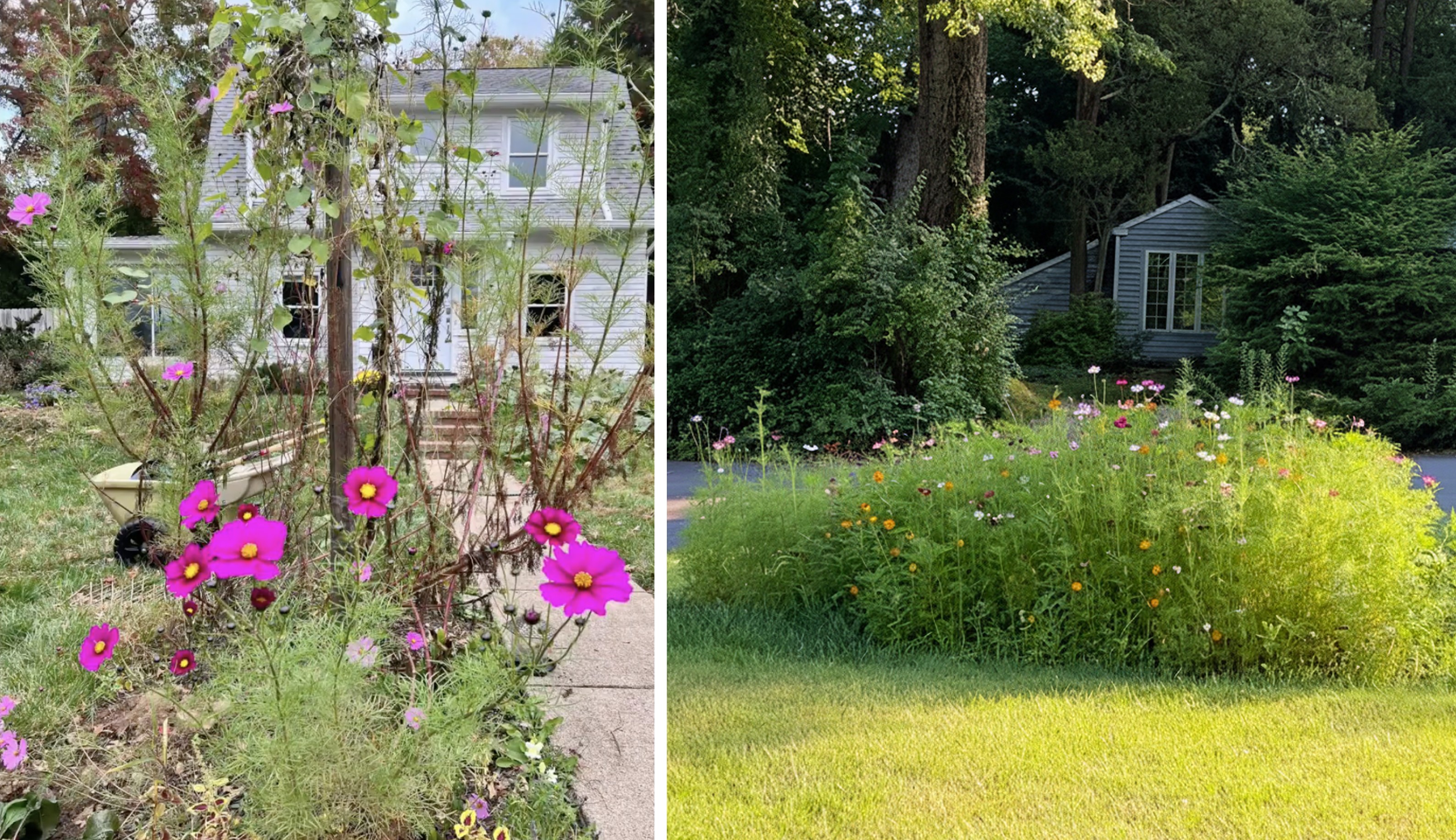 Look at the cosmos plants on the left. That's what I ended up with: over 6 feet tall, dry yellow leaves, and just an eyesore — apart from the beautiful blooms. The cosmos on the right — green, whimsical, airy. That's the meadow I have since learned to plant.